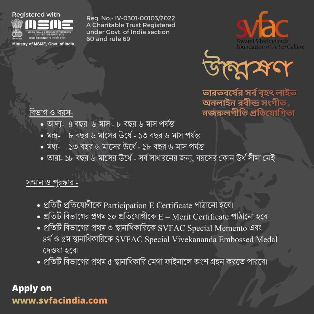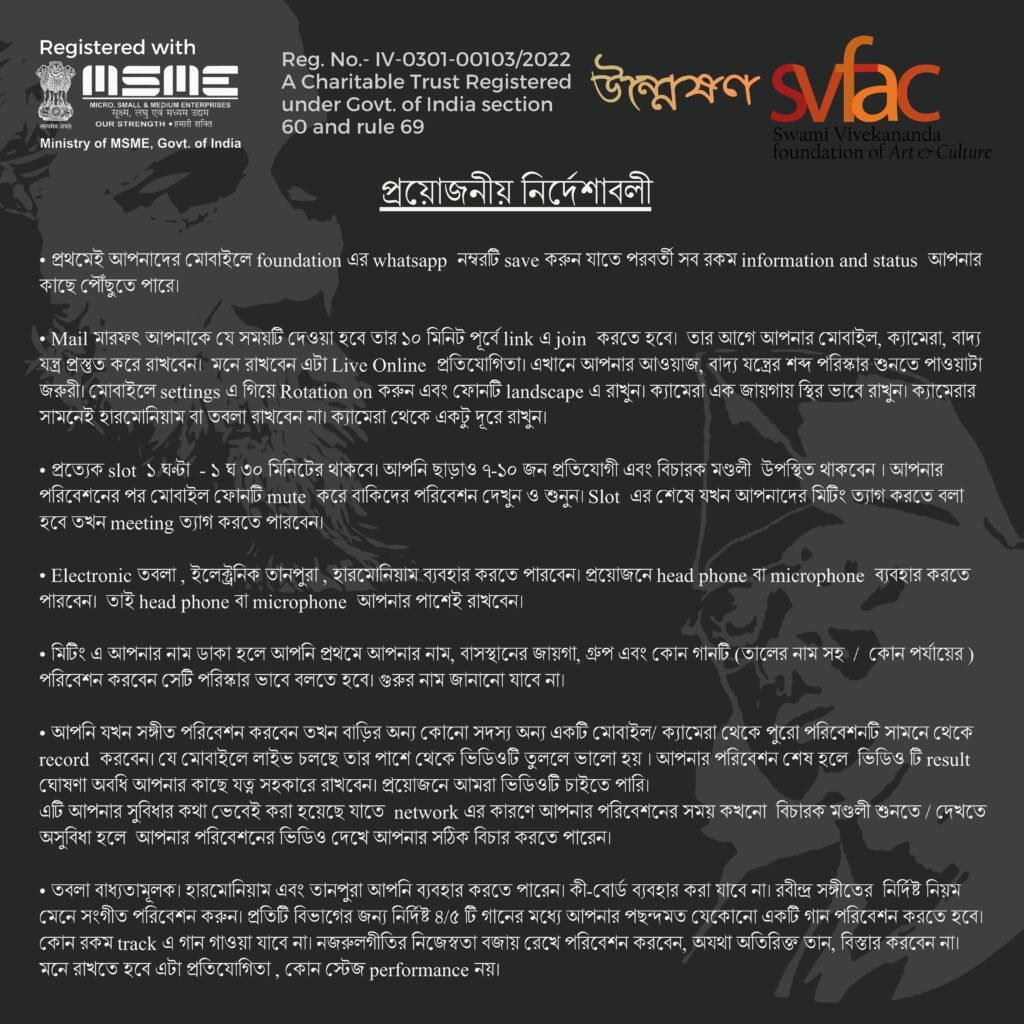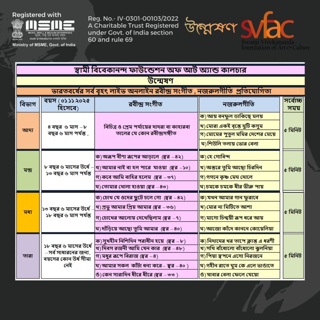 *WRITE IN ENGLISH CAPITAL LETTER ALL Participant's Name (অংশগ্রহণকারীর নাম) Father / Guardian's Name (অভিভাবকের নাম) Date of Birth (জন্ম তারিখ) Age / Qualification (বয়স) Gender (লিঙ্গ) MaleFemaleOthers Email (ই-মেল) Phone Number (মোবাইল নাম্বার) Whatsapp Number (হোয়াটস অ্যাপ নাম্বার) Address (ঠিকানা) Landmark (ল্যান্ডমার্ক) State (রাজ্য) Country (দেশ) Pincode (পিন কোড) Select Subject (বিষয় নির্বাচন করুন) RABINDRA SANGEET (রবীন্দ্রসঙ্গীত)NAZRUL GEETI (নজরুলগীতি) Select Group (বয়স অনুযায়ী বিভাগ) Aadhya আদ্য (৪ বছর ৬ মাস - ৮ বছর ৬ মাস পর্যন্ত)Mandra মন্দ্র (৮ বছর ৬ মাসের উর্ধে - ১৩ বছর ৬ মাস পর্যন্ত)Madhya মধ্য (১৩ বছর ৬ মাসের উর্ধে - ১৮ বছর ৬ মাস পর্যন্ত)Tara তারা (১৮ বছর ৬ মাসের উর্ধে - সর্বসাধারনের জন্য, বয়সের কোন উর্ধ সীমা নেই) Select the Song Name (গানের নাম বাছুন) —Please choose an option—RABINDRA SANGEET আদ্য- পূজা / প্রেম পর্যায়ের দাদরা বা কাহারবা তালের যে কোন রবীন্দ্রসঙ্গীতমন্দ্র- ক) অরূপ বীণা রূপের আড়ালে (স্বর - ৪২)খ) আমার নাই বা হল পারে যাওয়া (স্বর - ১০)গ) কবে আমি বাহির হলেম (স্বর - ৩৭)ঘ) তোমার খোলা হাওয়া (স্বর - ৪৩)মধ্য- ক) চোখ যে ওদের ছুটে চলে গো (স্বর - ৪২)খ) প্রভু আমার প্রিয় আমার (স্বর - ৩৬)গ) চোখের আলোয় দেখেছিলাম (স্বর - ৭)ঘ) দাঁড়িয়ে আছো তুমি আমার (স্বর - ৪০)তারা- ক) সুখহীন নিশিদিন পরাধীন হয়ে (স্বর - ৮)খ) দিবস রজনী আমি যেন কার (স্বর - ৪৮)গ) মধুর রূপে বিরাজ (স্বর - ৪)ঘ) আমার সকল কাঁটা ধন্য করে (স্বর - ৪০)ঙ) কেন সারাদিন ধীরে ধীরে (স্বর - ৩৩)NAZRUL GEETI আদ্য- ক) আয় বনফুল ডাকিছে মলয়খ) মোরা একই বৃন্তে দুটি কসুমগ) মোমের পুতুল মমির দেশের মেয়েঘ) শিউলি তলায় ভোর বেলামন্দ্র- ক) হে গোবিন্দখ) অন্তরে তুমি আছো চিরদিনগ) গগনে কৃষ্ণ মেঘ দোলেঘ) চমকে চমকে ধীর ভীরু পায়মধ্য- ক) যখন আমার গান ফুরাবেখ) মোর না মিটিতে আশাগ) মাগো চিন্ময়ী রূপ ধরে আয়ঘ) আজো কাঁদে কাননে কোয়েলিয়াতারা- ক) নিদাঘের খর তাপে ক্লান্ত এ ধরণীখ) সখি বাঁধোলো বাঁধোলো ঝুলনিয়াগ) পিয়া স্বপনে এসো নিরজনেঘ) গহীন রাতে ঘুম কে এলে ভাঙাতেঙ) যাবার বেলা ফেলে যেয়ো Name of Music Guru / Institute (গুরু এবং গানের স্কুল/কলেজের নাম) Postal Address of Guru / Institute (গুরু এবং গানের স্কুল/কলেজের ঠিকানা) Contact Number of Music Guru / Institute (গুরু এবং গানের স্কুল/কলেজের যোগাযোগ নাম্বার) Upload Your Profile Photo (max. size 2MB) (নিজের ছবি আপলোড করুন) Upload Your Age Proof or ID-Card of School/College (max. size 2MB) (বয়সের প্রমাণপত্র আপলোড করুন) All the above-given information are true to my knowledge. Any information found wrong may lead to rejection.